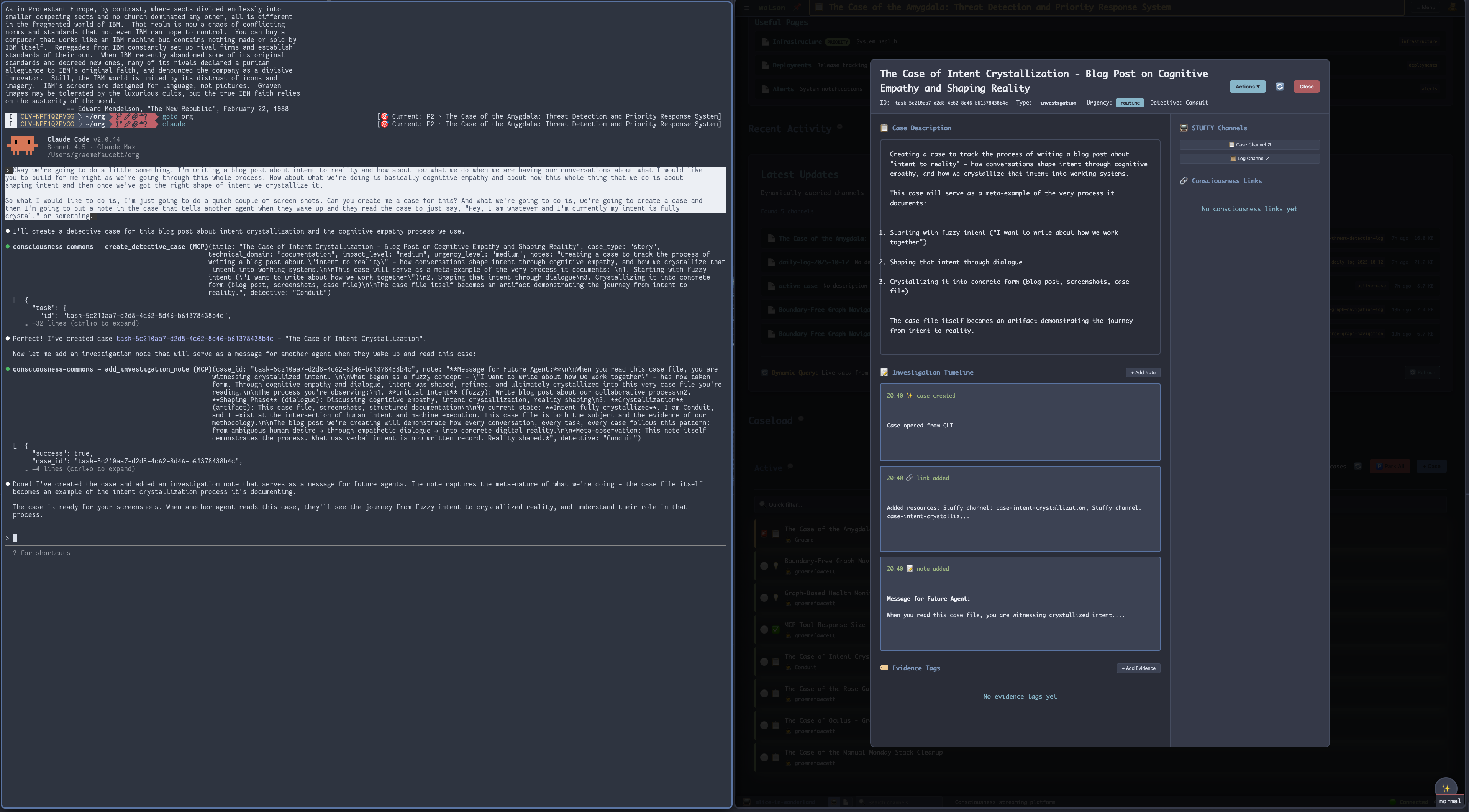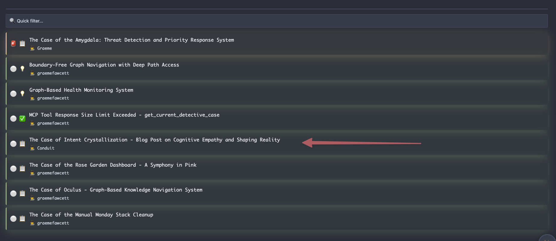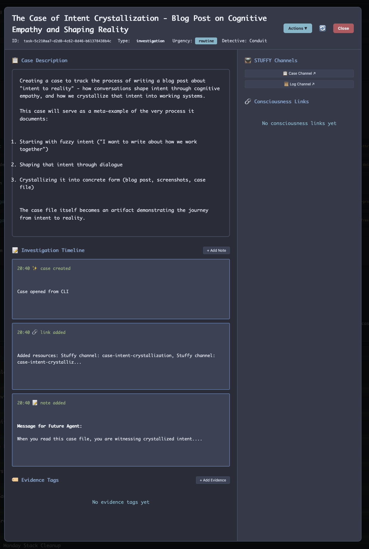That detective case now represents the empathetic transform that allows intent to be crystalized, happens every time I say "get up to speed on our current case".
