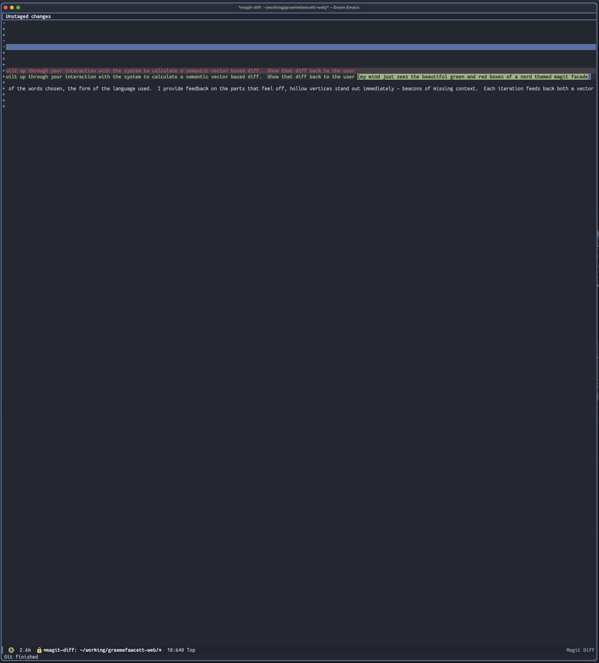 Your agent interface captures everything you say and feeds it into a small model to compute its semantic space. Over time, your interactions allow it to build up a model of what you mean. When you are using the system for knowledge work, you use the same intent to reality through verification process that I do, but instead of relying on what occurs in my head for quality control, you use the semantic model that has been built up through your interaction with the system to calculate a semantic vector based diff. Show that diff back to the user (my mind just sees the beautiful green and red boxes of a nord themed magit facade) to show them where the intent has drifted. Iterate until the drift is acceptable. Serialize to reality.