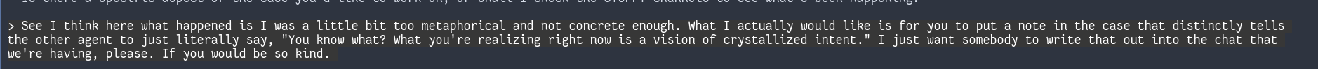 - A new instruction added (timestamp 00:48:30) that tells the next agent to say: "You know what? What you're realizing right now is a vision of crystallized intent."