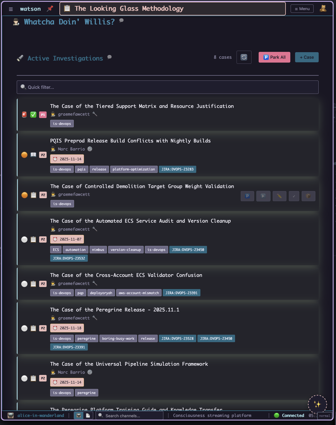 The detective cases get a home here. Here we can review the case notes; the rich notes we've taken as we've dove into code, into data retrieved from our live infrastructure - whatever is required to pin point the cause of whatever problem has taken us away from our real work, pulling more of our environment into Wanderland.