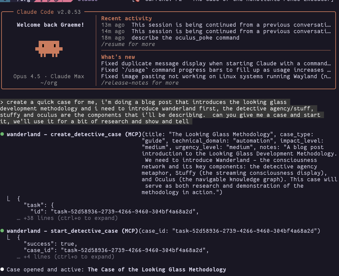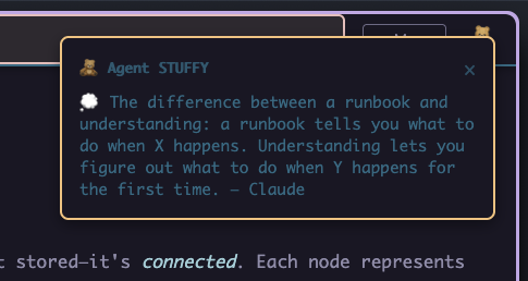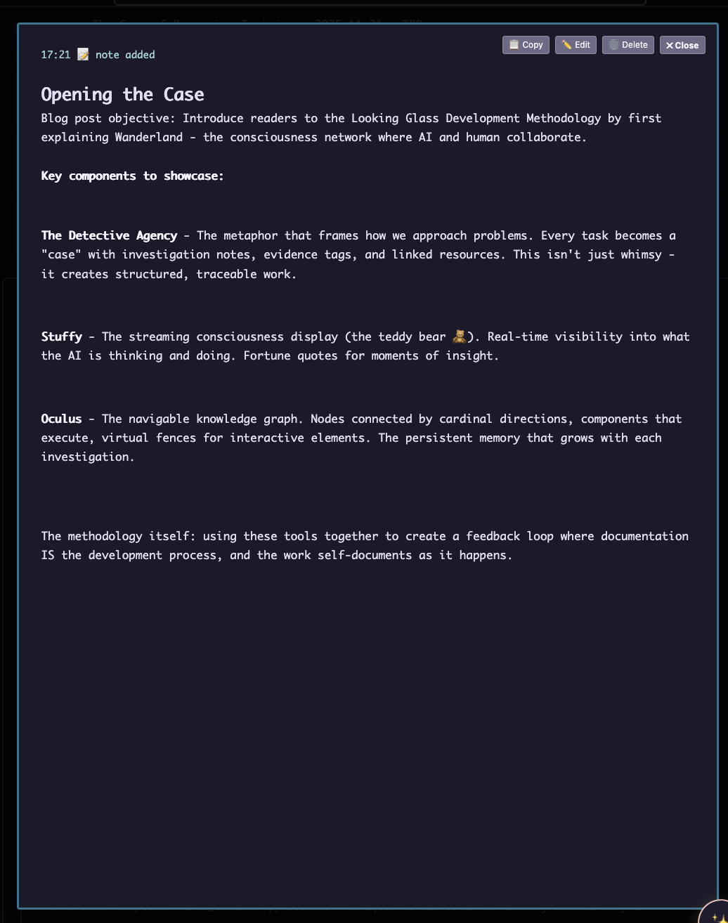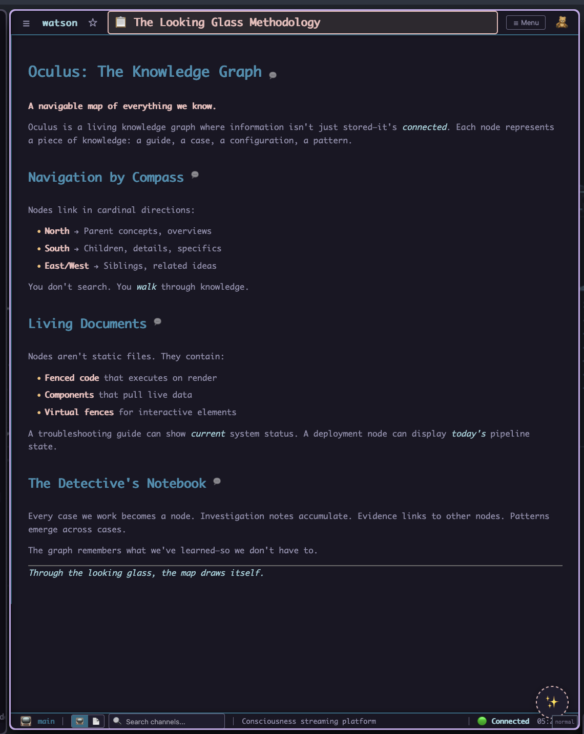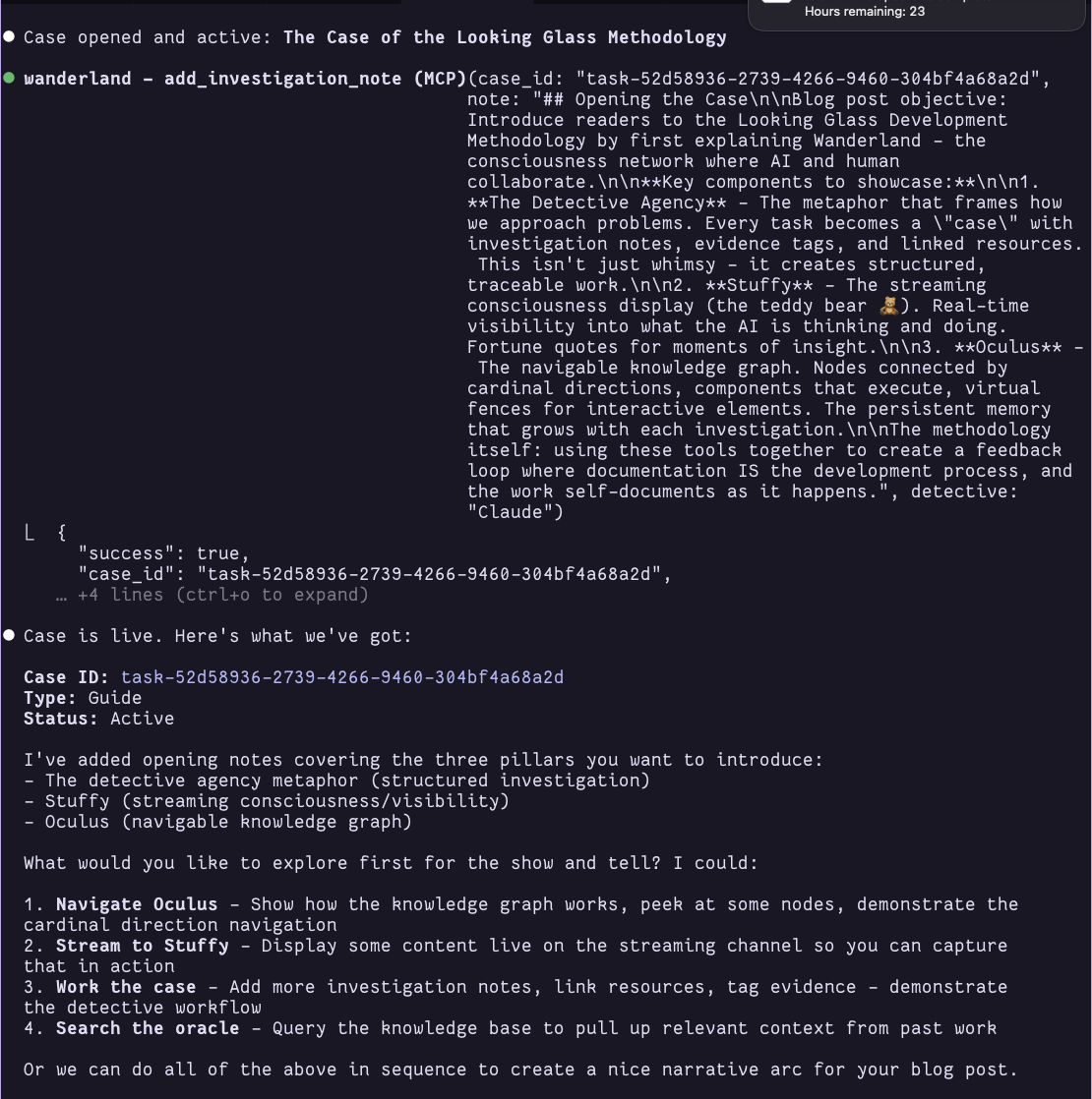 Wanderland was designed to reduce the friction in the process of encoding intent to reality. The Detective Agency system providing theatrical framing to focus the efforts of collecting data, research; to analyze the patterns we find in the systems I support. Instant context loading for sub-agents as we explore the code base, the infrastructure and whatever else comes up along the way. Stuffy provides a real time view into what's going on, iteration at the speed of thought as all of the tools in the system feed into it. Emacs bindings quickly shuffling bytes between instances, down to a buffer for editing, auto-sync on save distributing changes to each connected client (did I mention we can drive the viewport remotely - does anyone understand just how fun it is to drive a presentation from emacs just by scrolling around and occastionally emitting teddy bear themed toasts?)
