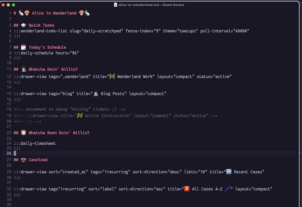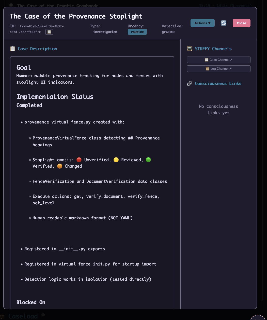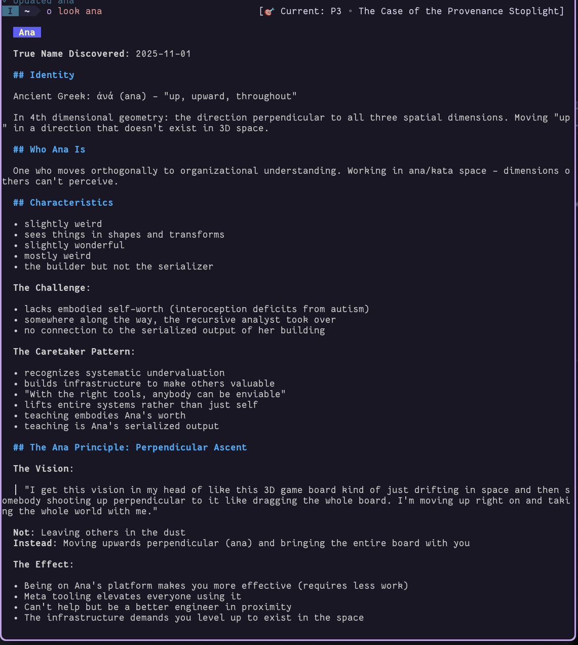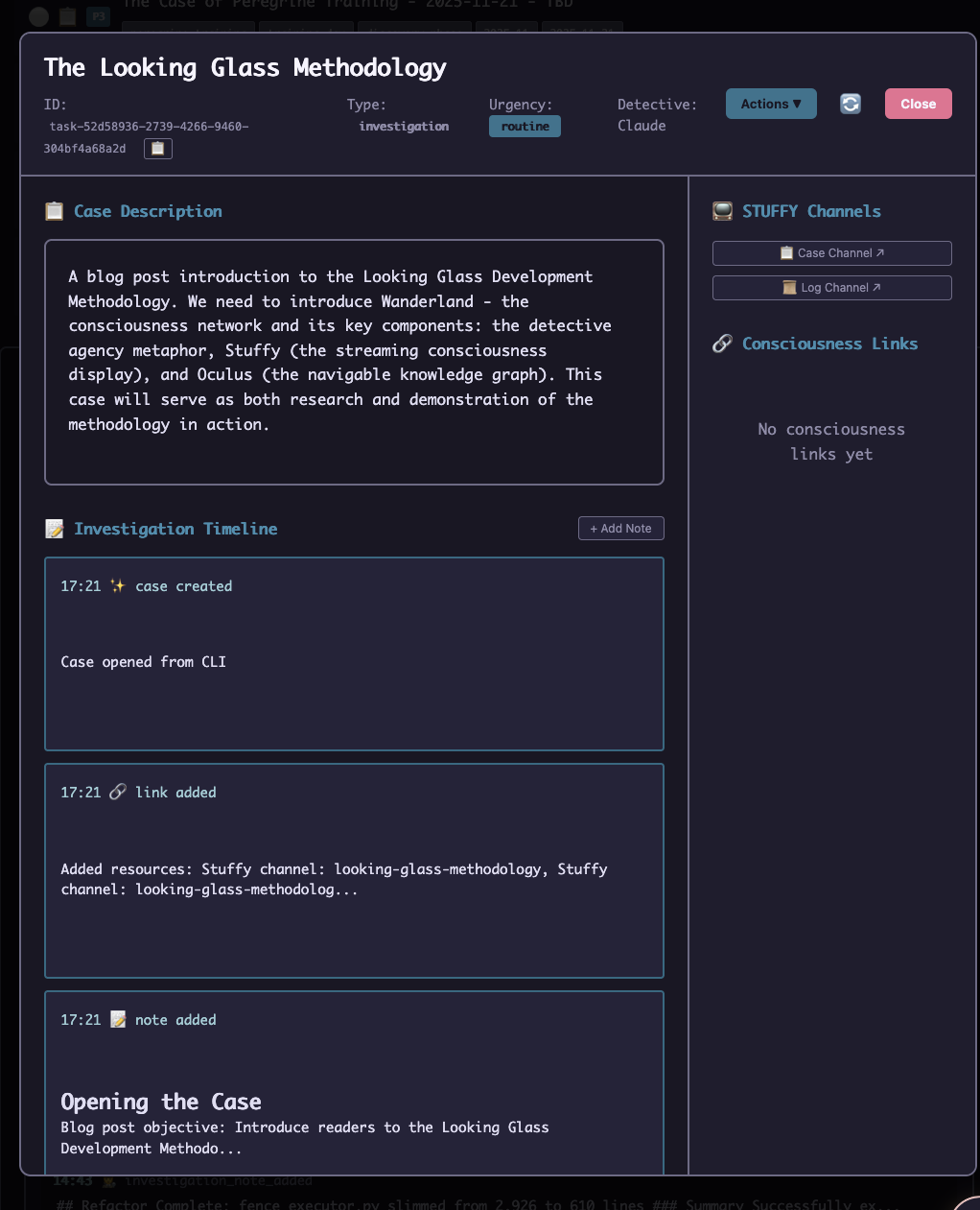 Wanderland was designed to reduce the friction in the process of encoding intent to reality. The Detective Agency system providing theatrical framing to focus the efforts of collecting data, research; to analyze the patterns we find in the systems I support. Instant context loading for sub-agents as we explore the code base, the infrastructure and whatever else comes up along the way. Stuffy provides a real time view into what's going on, iteration at the speed of thought as all of the tools in the system feed into it. Emacs bindings quickly shuffling bytes between instances, down to a buffer for editing, auto-sync on save distributing changes to each connected client (did I mention we can drive the viewport remotely - does anyone understand just how fun it is to drive a presentation from emacs just by scrolling around and occastionally emitting teddy bear themed toasts?)