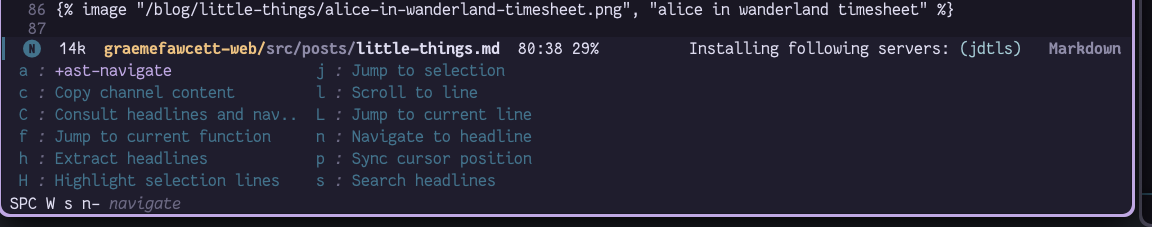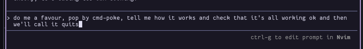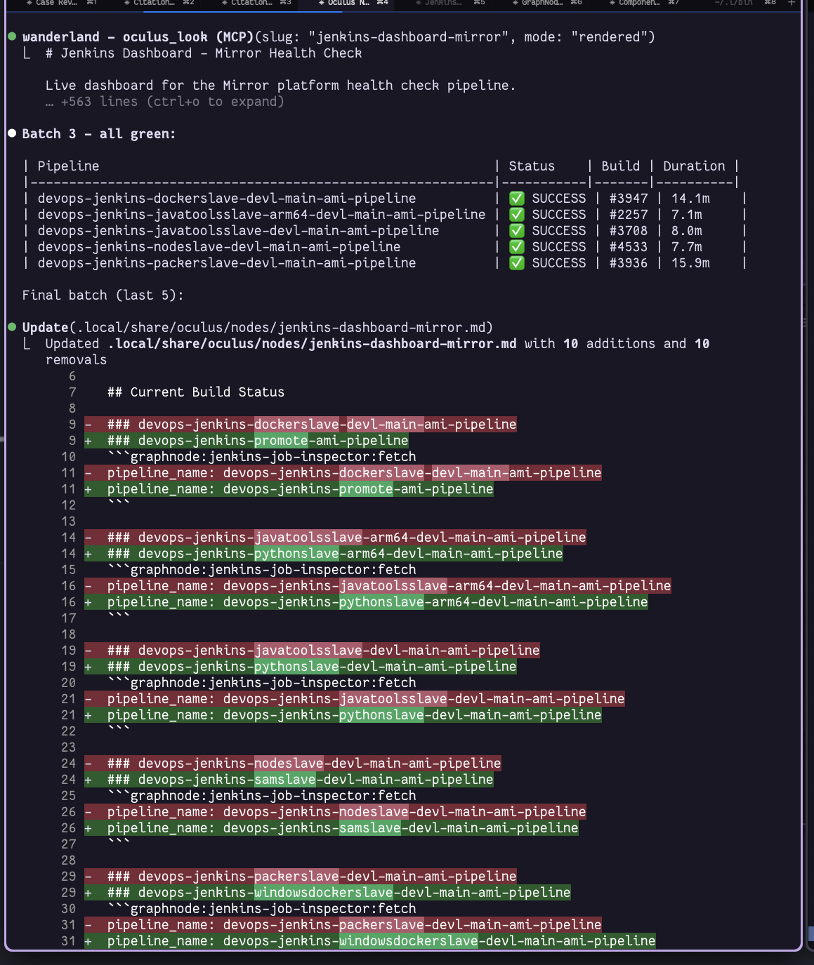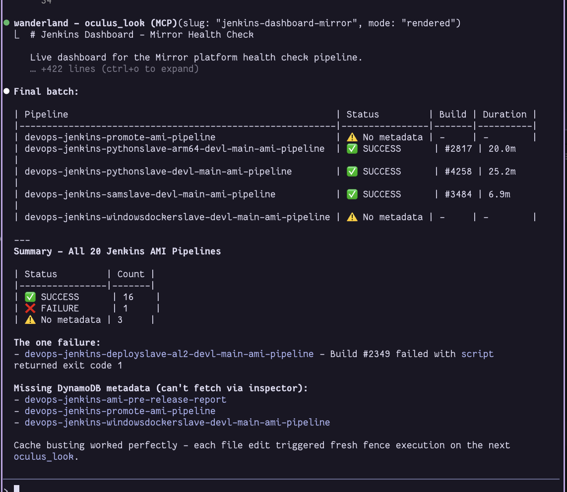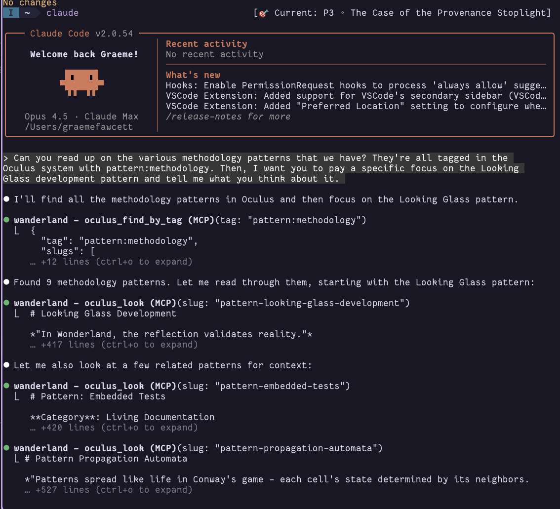 Wanderland was designed to reduce the friction in the process of encoding intent to reality. The Detective Agency system providing theatrical framing to focus the efforts of collecting data, research; to analyze the patterns we find in the systems I support. Instant context loading for sub-agents as we explore the code base, the infrastructure and whatever else comes up along the way. Stuffy provides a real time view into what's going on, iteration at the speed of thought as all of the tools in the system feed into it. Emacs bindings quickly shuffling bytes between instances, down to a buffer for editing, auto-sync on save distributing changes to each connected client (did I mention we can drive the viewport remotely - does anyone understand just how fun it is to drive a presentation from emacs just by scrolling around and occastionally emitting teddy bear themed toasts?)