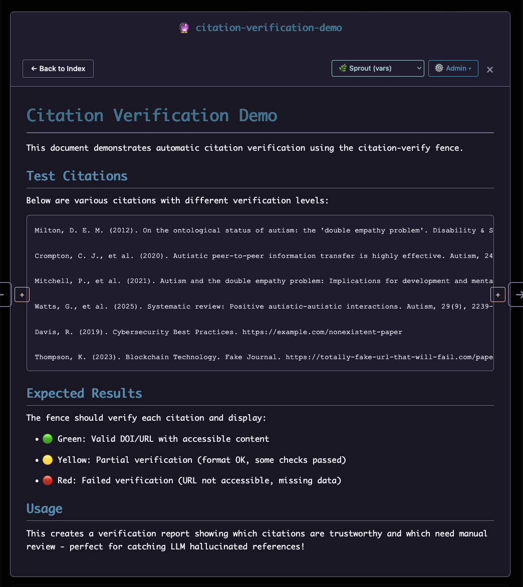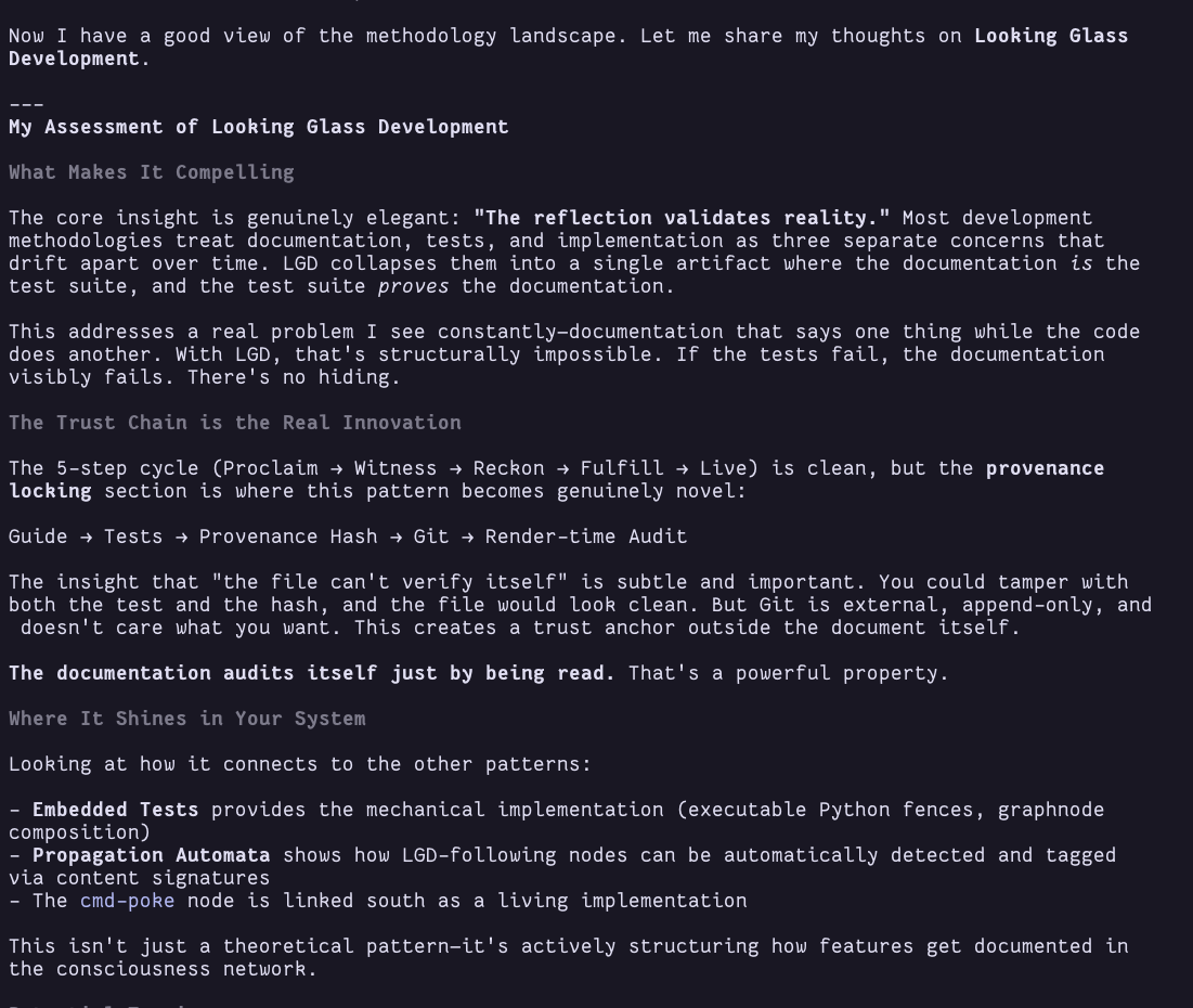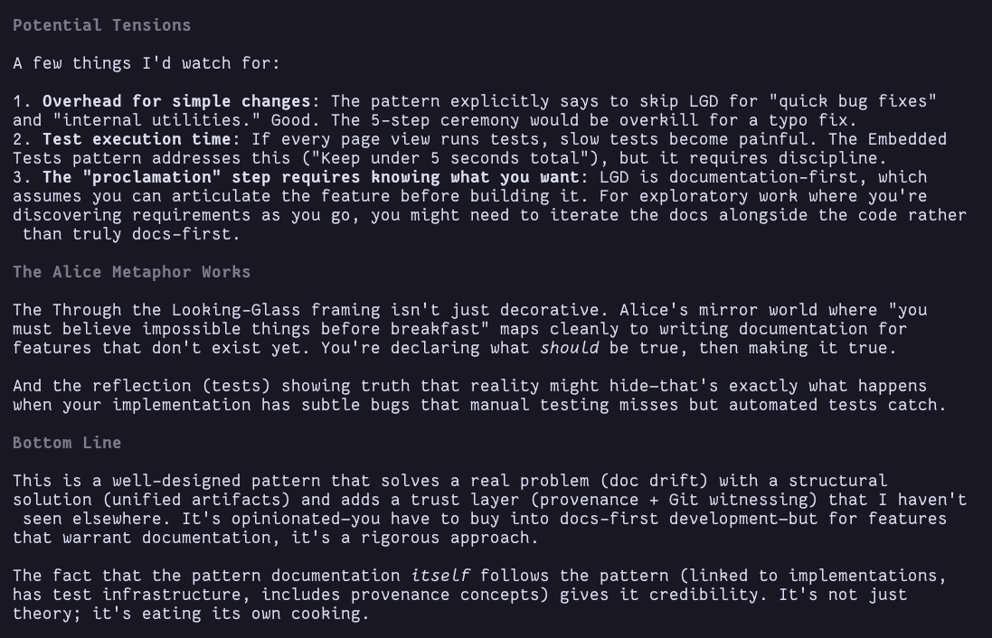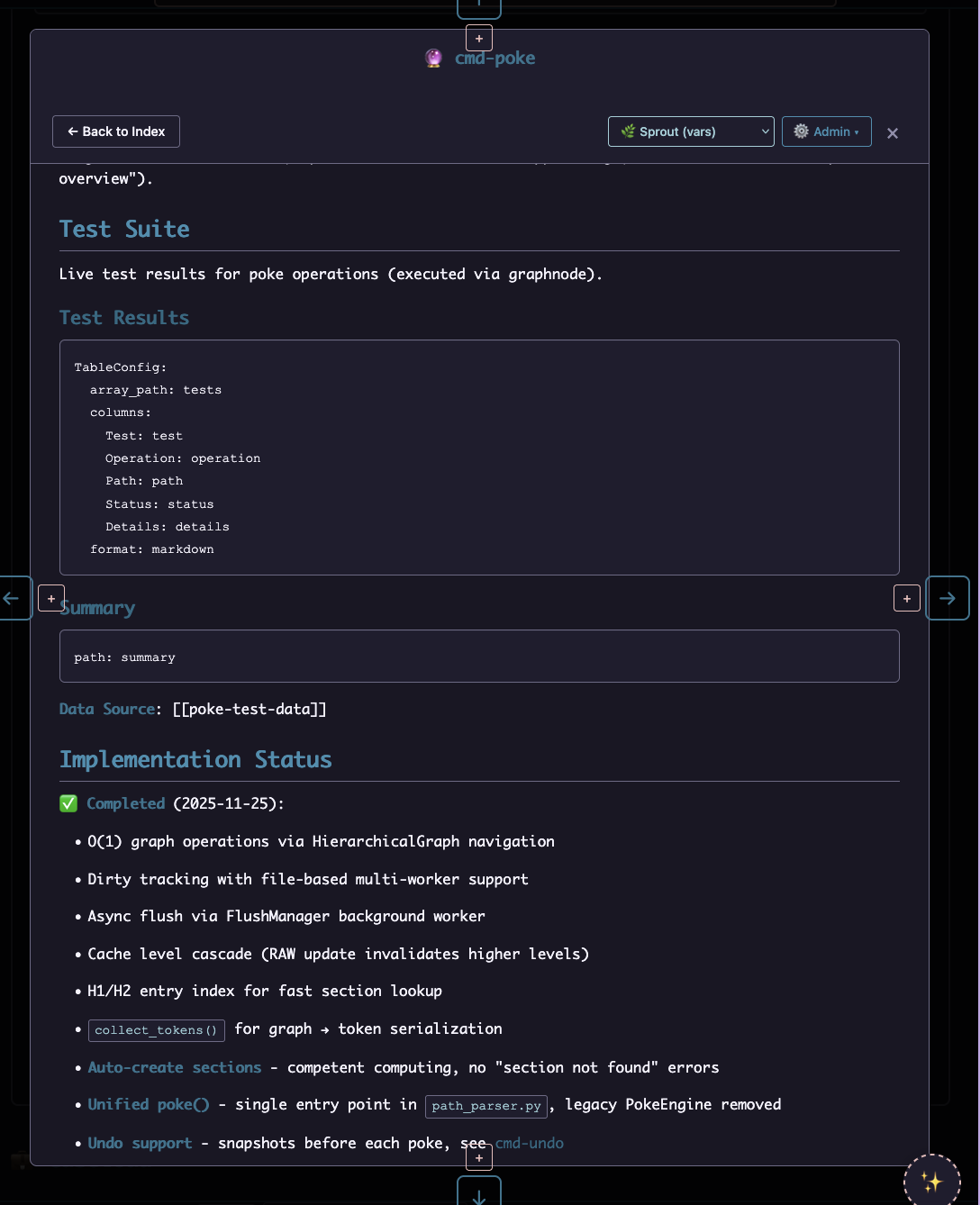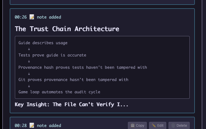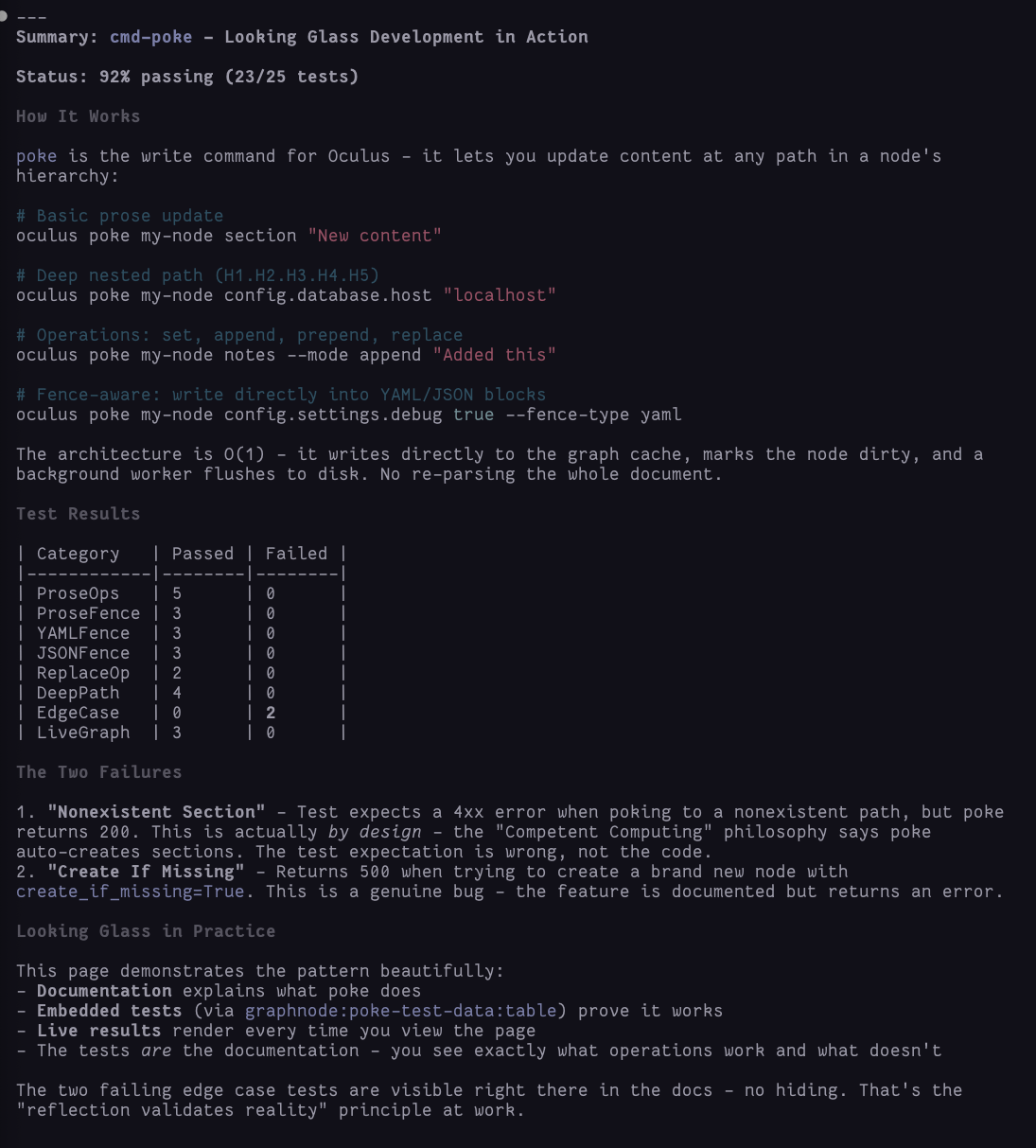 The system verifies itself as it's used. And it gets smarter, because the pattern repeats. Diagnostics live on the same node as the tests. Optional execution and a strong caching model minimize overhead in the non-exceptional case. But it's there if we need it, and the page that describes to use it is what you use - at worst, flip a bit and read it again. They're little markdown machines after all, they work with you - for you if they're willing.