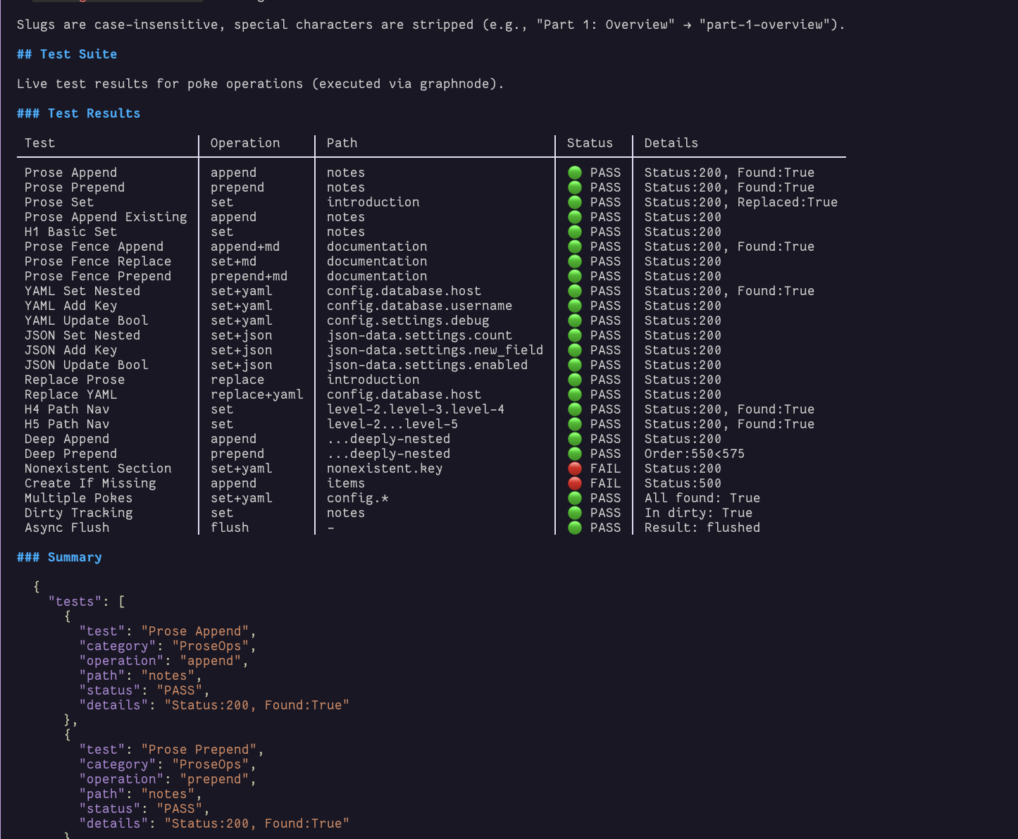 The GraphNode contract fulfilled by just wrapping what they were going to do anyways (Python test scripts) in what they love to do (write Markdown) and then we just capture it in our graph for eternity. The laziest way I could think of to verify correctness.