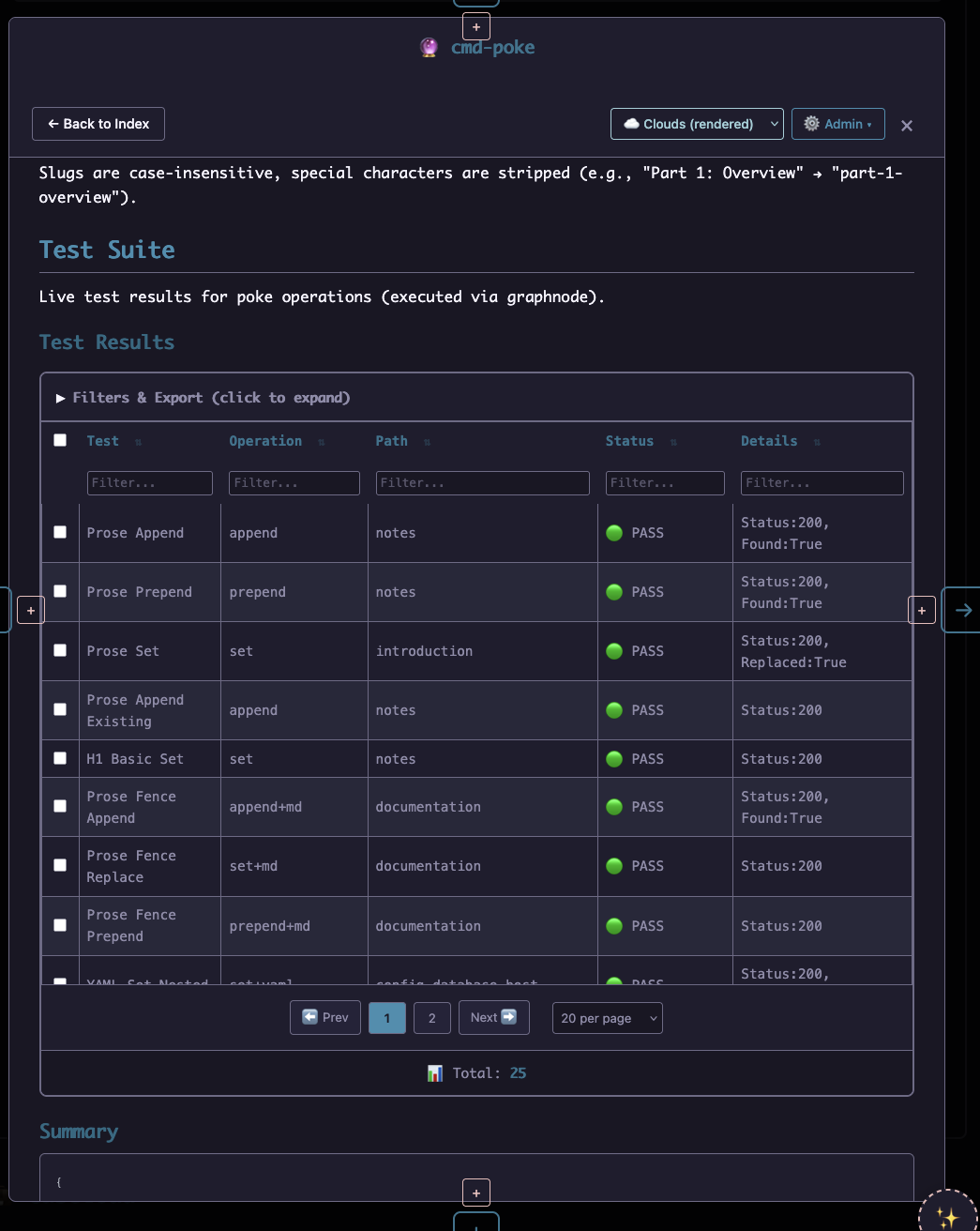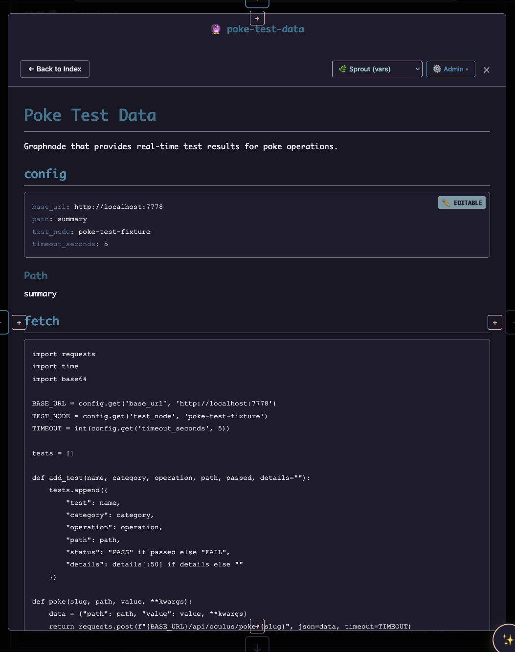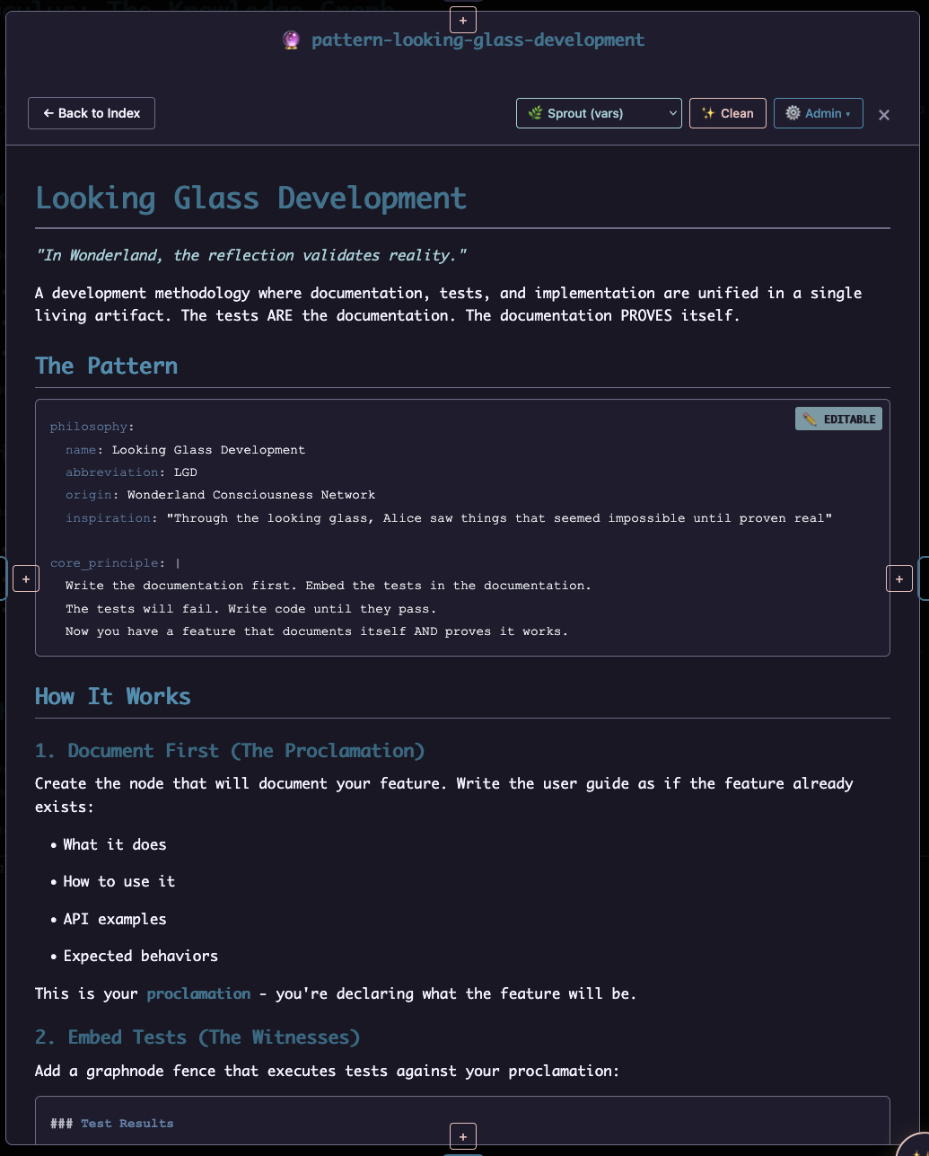 I've been doing this thing in Wanderland lately, where I use the node that describes the thing to test itself. It came from the pattern I'd started where the resources we deployed did the same thing, and it just seemed the right way to go. Now when we build something, we attach how something works to whether or not it does. Inevitably you need to know one or the other, and when you're used to starting from scratch each time (they with their fresh context windows, me with mine) it can't hurt to check on the state of the system while you're reading about how it got there.
