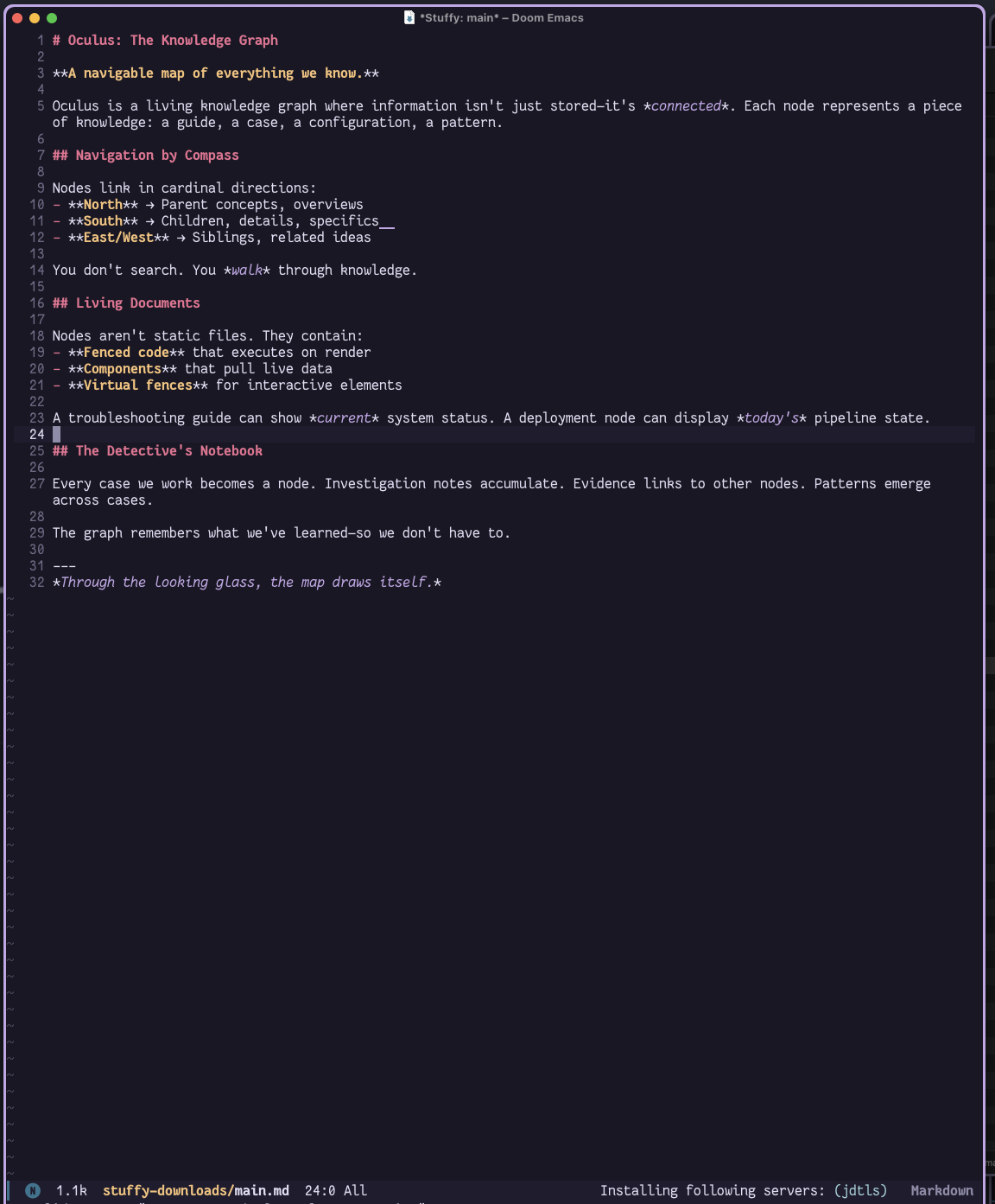 And it's all sitting beside Oculus**, the API that sits on top of the substrate. The computational markdown that makes it all work. It's what Anthropic should have done with skills, markdown files with little computational machines embedded in it.