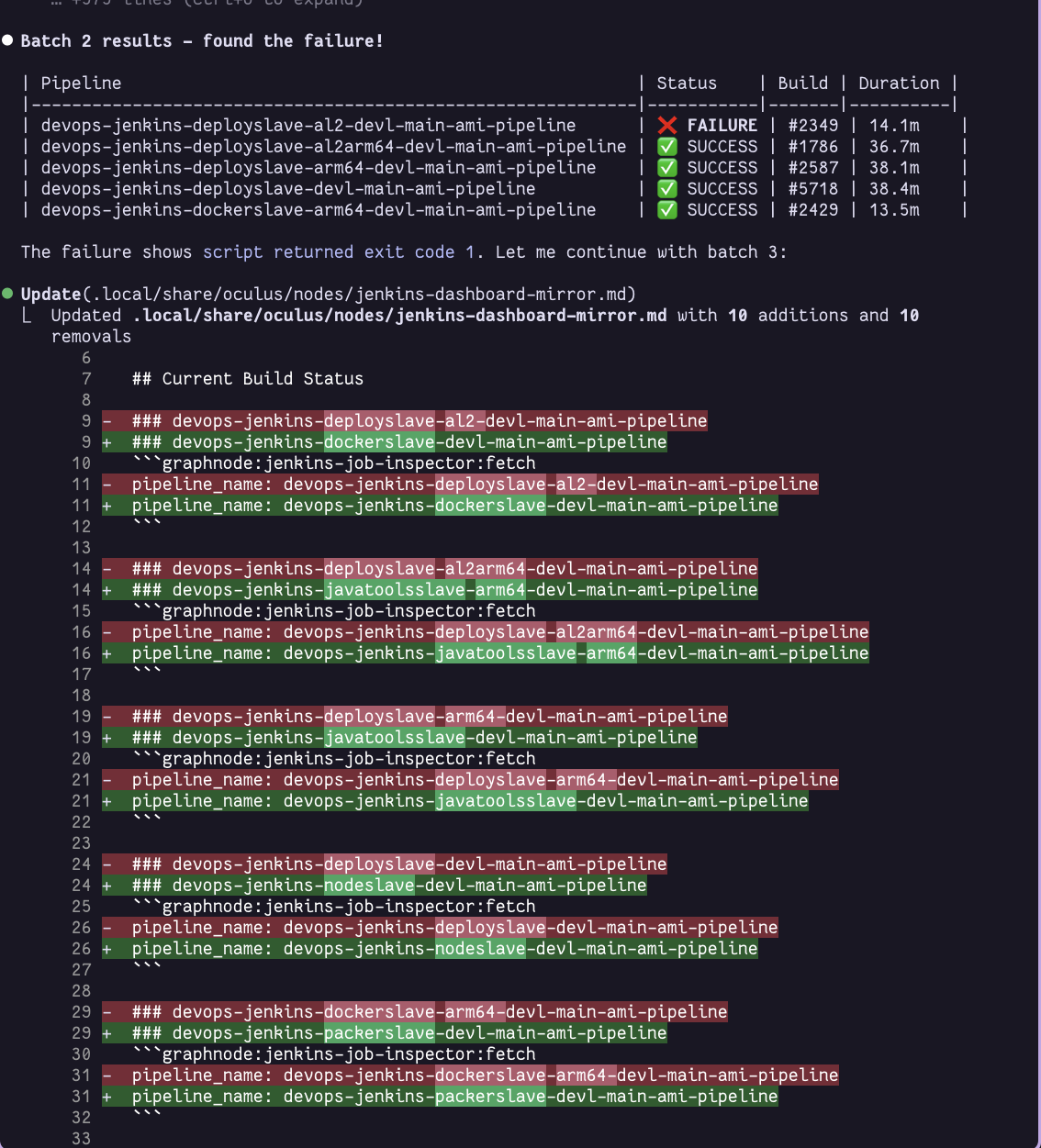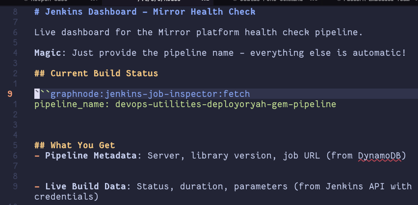 I just came across that node the other day. It's a little fence that drops a Jenkins dashboard on the page, build details, log output, all by just referencing the pipeline name. The fence and a clever sprinkling of metadata lookups do the rest. Now we can put that anywhere we want, point to anywhere we want.