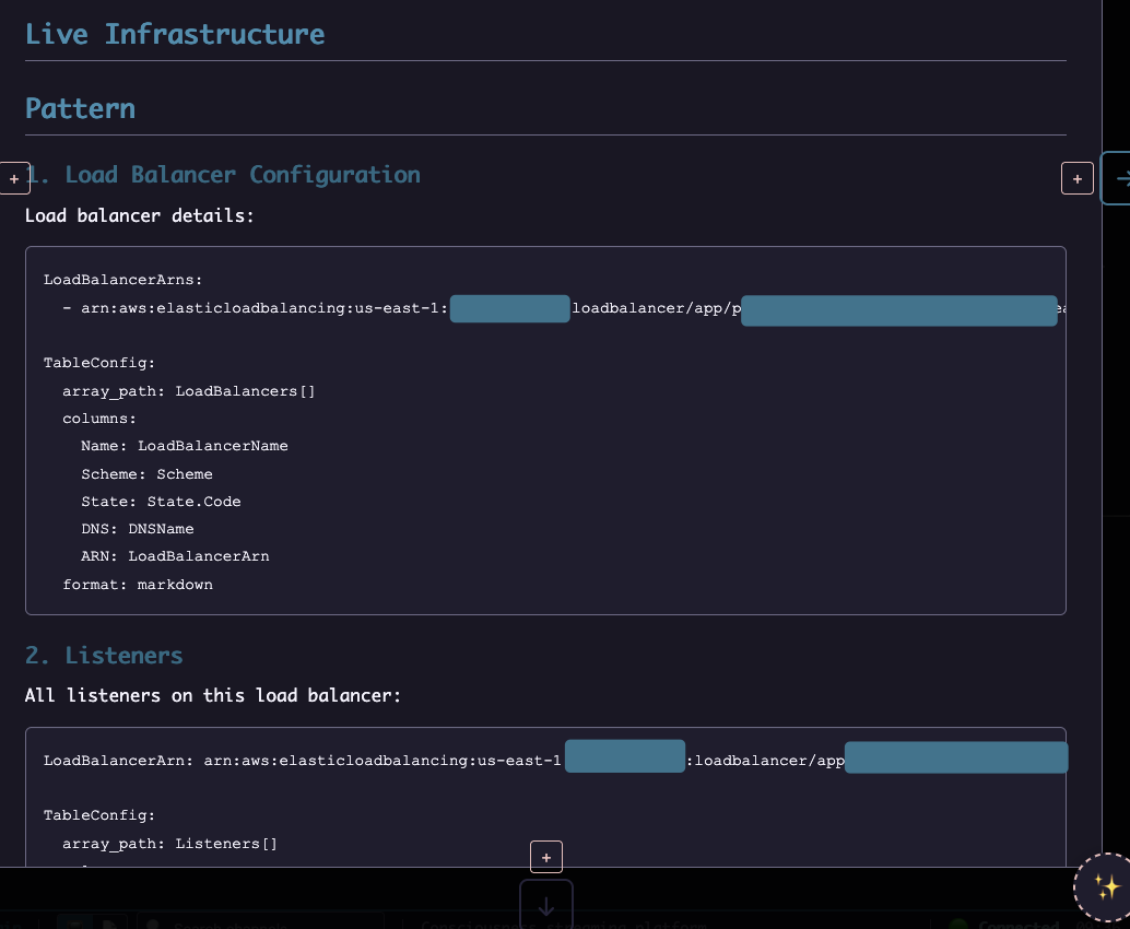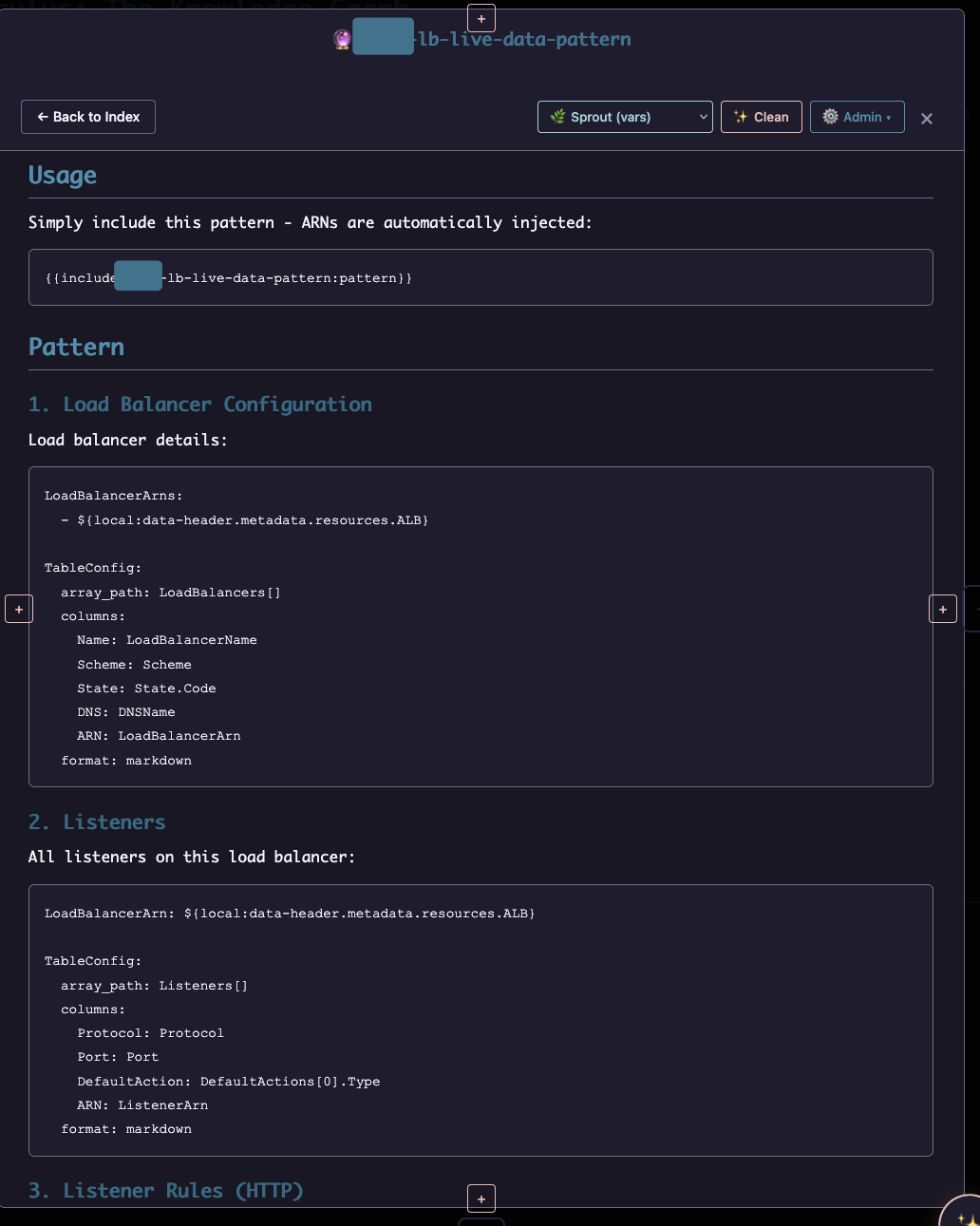 And it's all a pattern, with the configuration sourced from a YAML fence at the top of the page at the time of inclusion. (Soon to be replaced by a live look into my former favourite graph - Peregrine our in house developer platform where the same pipeline reference we'll show below in a agentic demo can also fetch a wealth of information about the infratructure it deploys).