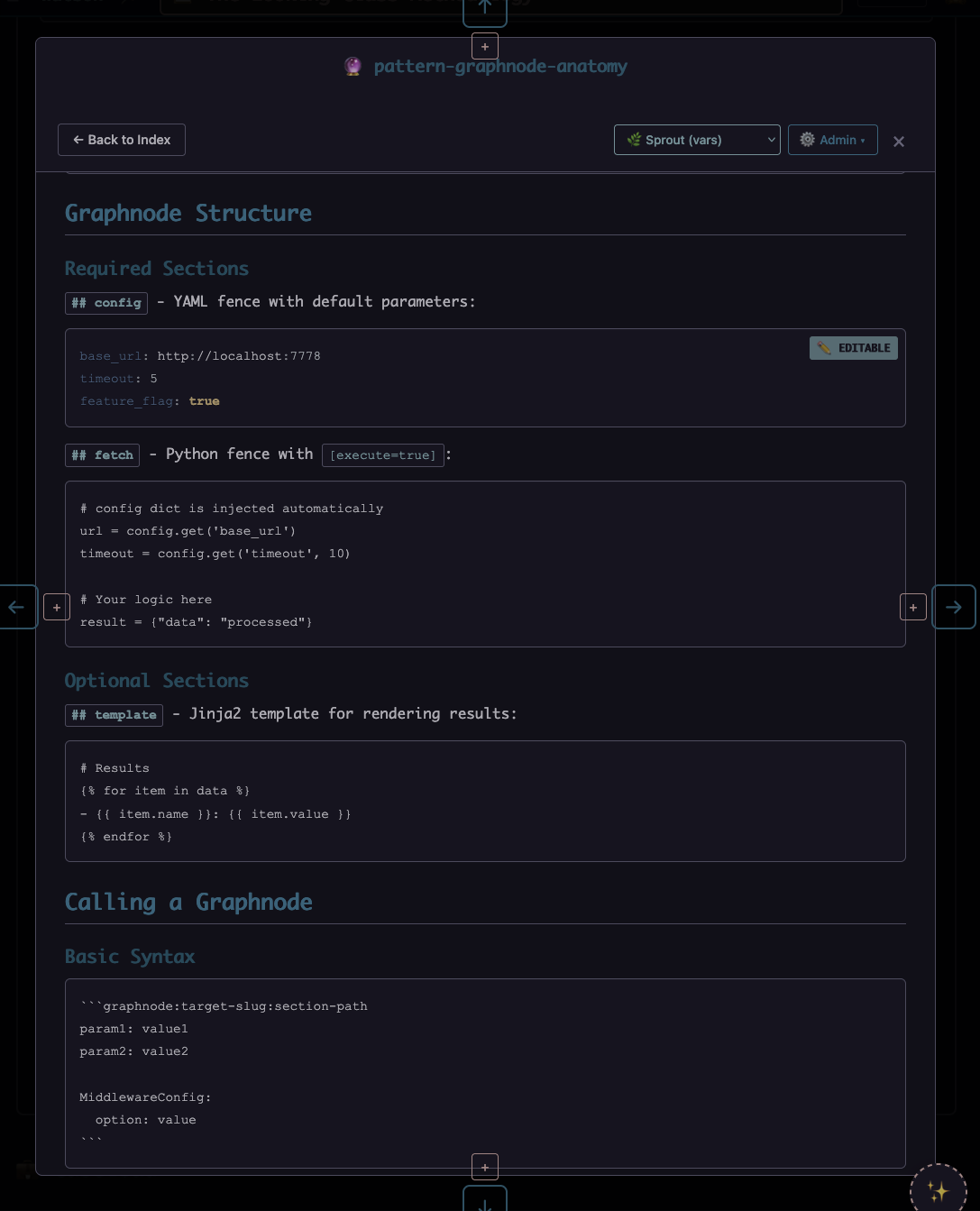 Take a GraphNode fence, the page that describes how the node works and how to integrate it into your whatever it is you're composing also contains the YAML fence that configures the function (we do YAML based registers in this house!) and the Python fence that executes it. We'll even through in a separate header to transpile the result dict via Jinja2 for free if you call now ;) And that's it, the page that does the thing describes the thing it does.