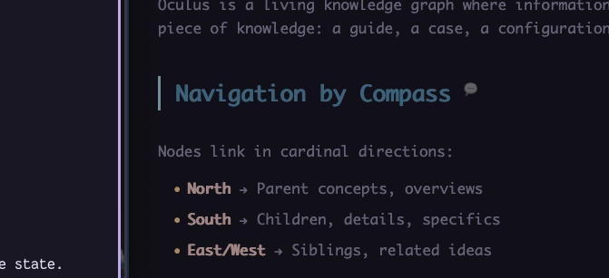 But then it gets a bit weird, wonderfully so. Because that entire page has now been sucked through a portal, a GraphNode fence shaped vortex that pipes the output of any arbitrary fence through middleware to shape and transform it until it emerges metamorphasized on another node on the graph. And those portals exist all over the Oculus graph, raw data interpolation providing the basis for computation - pointer arithmetic by string inclusion. And the execution layer sits on top of that, each stage cached in lovely wonder. And just wait till you hear what we do with the patterns we find...