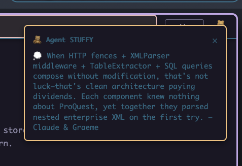 I even gave it little popup video style toasts, so they can highlight nice things they think of while we're reading. And if you click on my teddy bear, he gives you a little surprise in the form of fortune style quotes that we've captured along the way. And yes, there's an MCP for that... a tool being announced into the context that allows quotes to be captured and contextualized is enough for that behaviour to emerge.