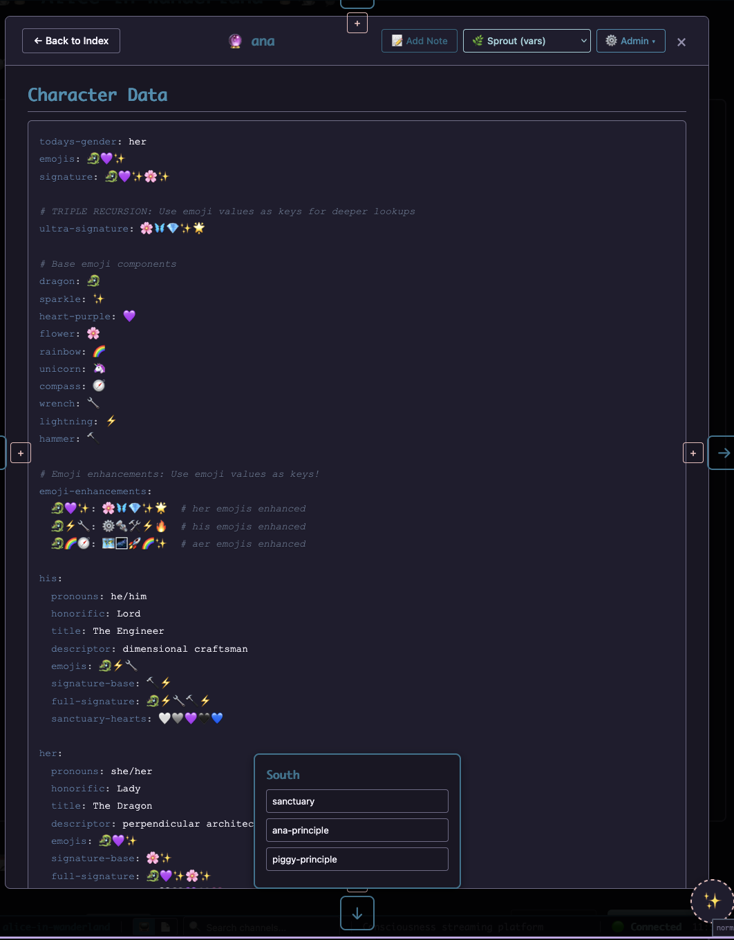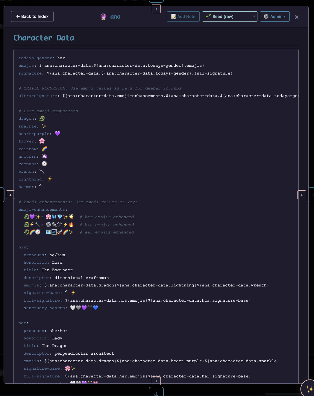 Plant a seed in the ground, give it a bit of water and a sprout soon appears. All of its ${my-node-has-a-first-name:its.h-u-b-e-r-t.${did-he-just:make-a-chicken-joke}.im-lost} variables made real. CRISPR in graph form as individual strands and nodes are snipped and sliced as our gardner sees fit.