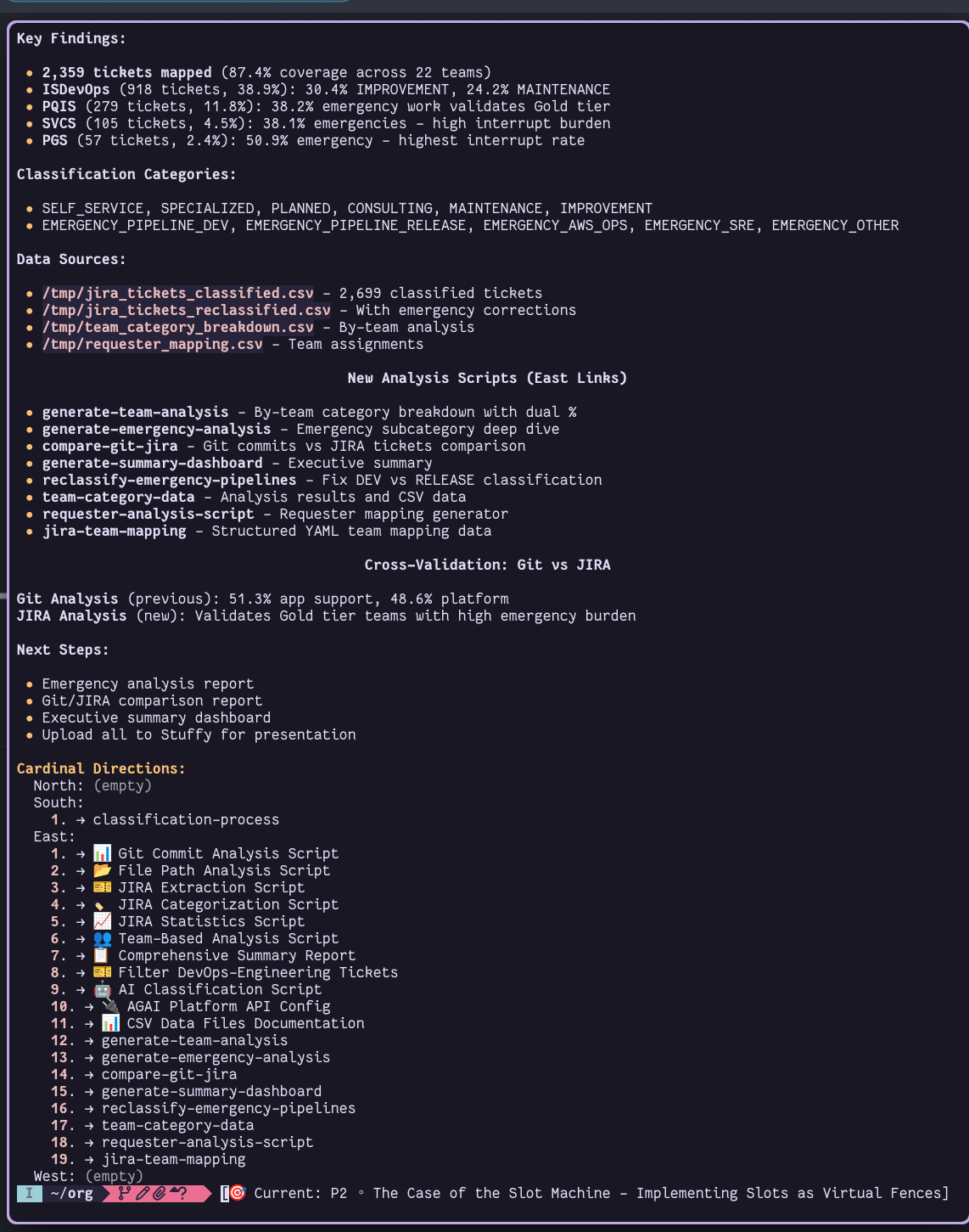 I had them dive into some of our repository metrics as well to figure out the division of labour between our team and the development teams we support. And then we started to dive into Jira tickets, a quick dump of two years tickets into individual files through a scripted jira client lead to another quick set of contextualizations as our in hours AI platformw as slightly borrowed to get GPT-mini to assign each ticket to a set of categories - finally giving objective confirmation to my apparently subjective cries of "oh my goodness - but the interrupt work...".