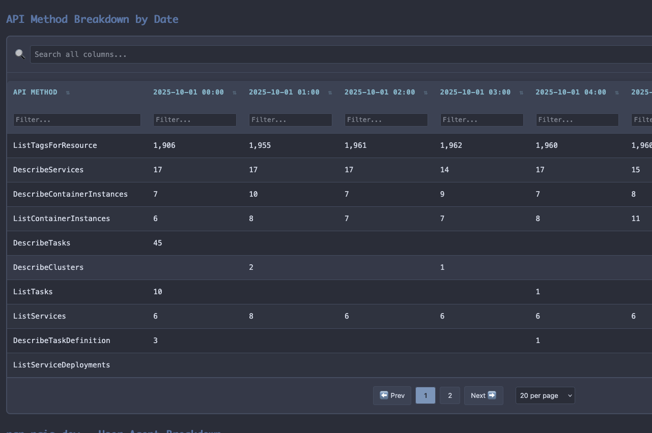 Quick fix and a new run, and the data showed something odd - DataDog agent versions differed between dev and prod and so did the call rates. Production was showing upwards of 90% of the sampled API calls from CloudTrail were ListTagsForResource, the same issue we'd had in dev earlier.